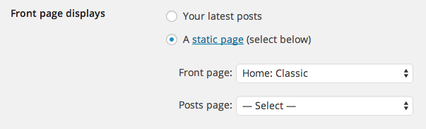 Now go to Settings > Reading select "A static page" and choose your newly created "Home"-page for the Front Page setting.