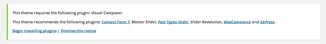 At this stage you have probably noticed a warning asking you to install the recommended plugins. Installing these is very easy - you just need to click 'Begin installing plugins' and you will be redirected to the plugin installation page where you can install any Plugin you want and need. Only the Visual Composer Plugin is required. All other plugins are optional, depending on the functionality you wish to use.