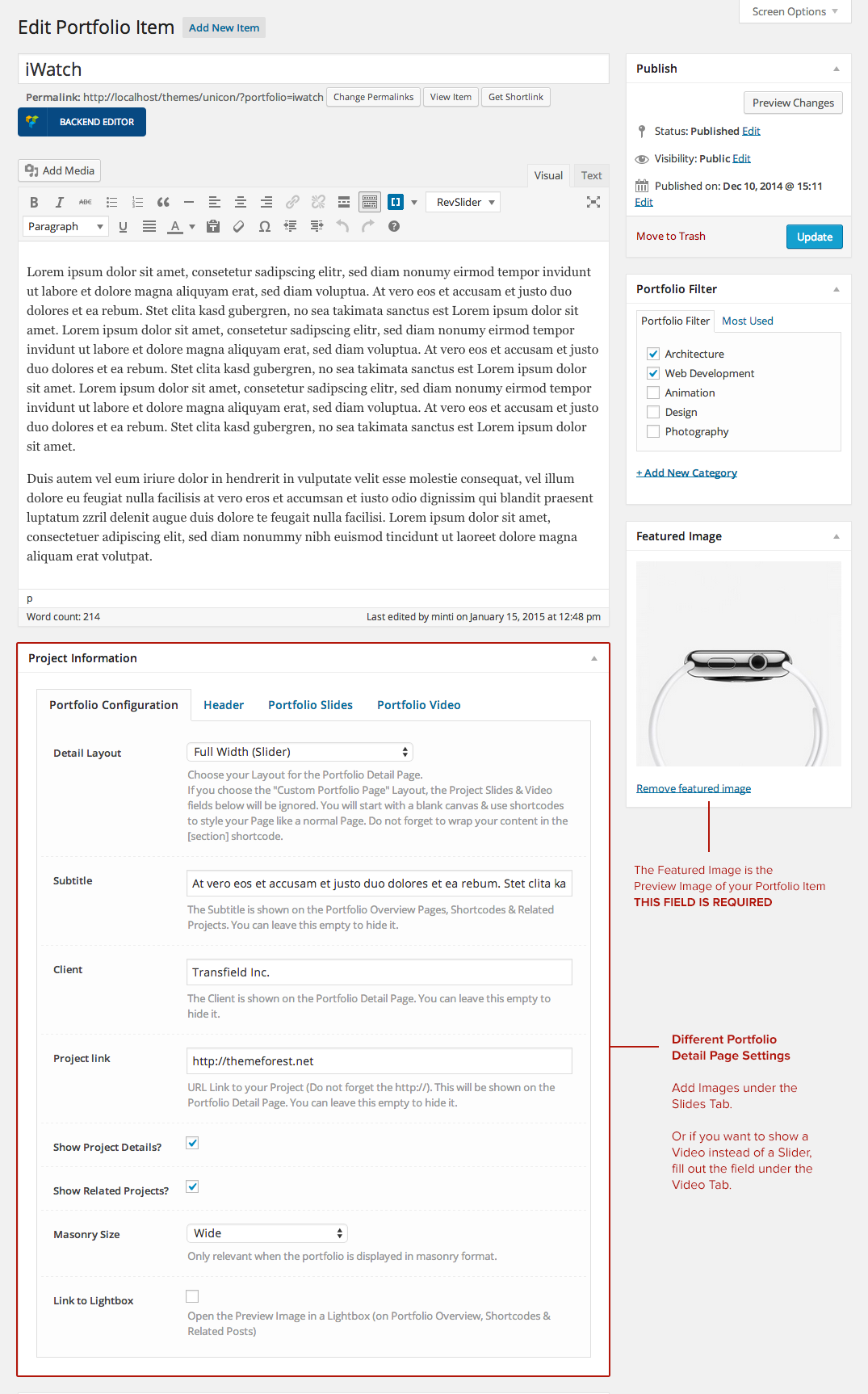 To add Portfolio items, go to your WordPress Admin Area and navigate to Portfolio > Add New. Now you can fill out the following Fields.