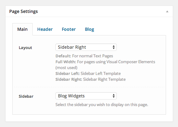 In the Page Settings (below the Text Editor) you can find different options for the Page Templates. You can choose to assign a Sidebar, decide which Widgets you want to show, Enable / Disable the Header and Footer and use different Titlebar Styles.